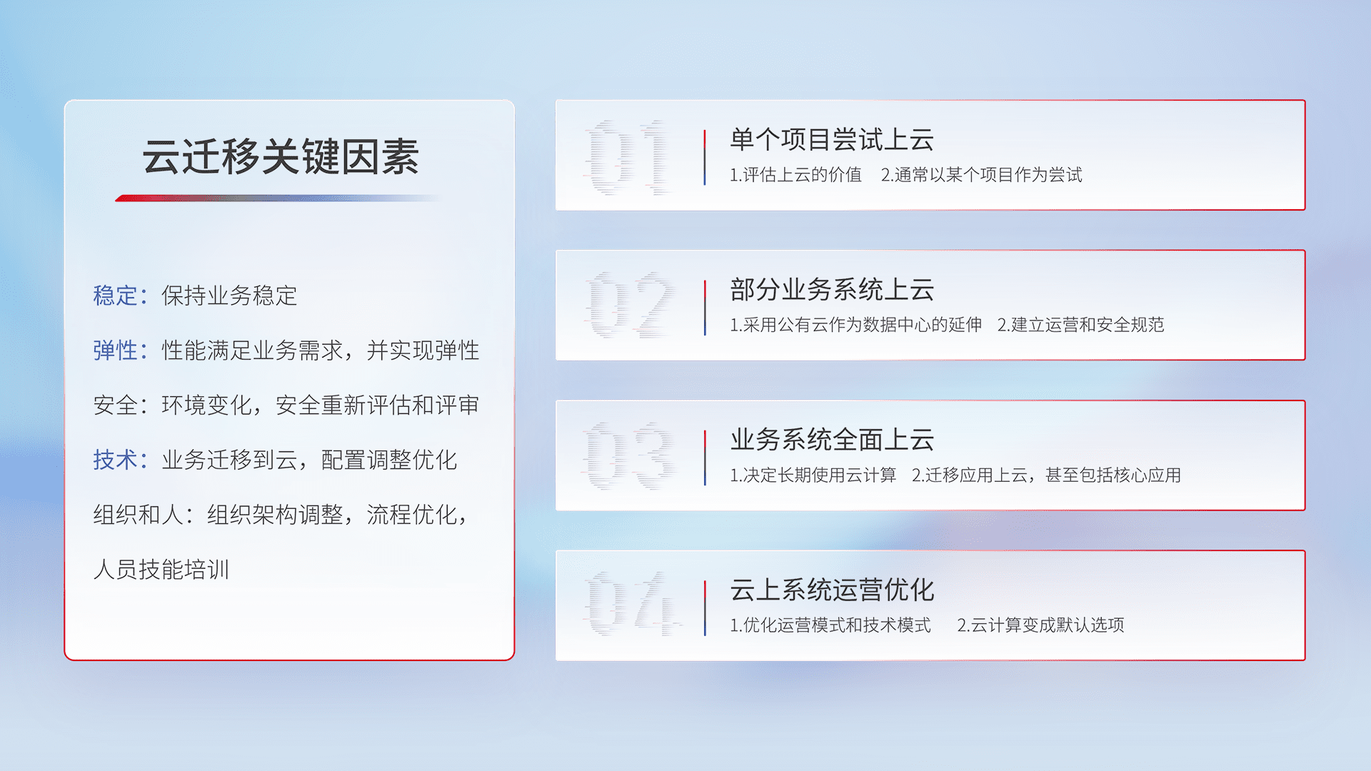 结合实际业务,,,从规划设计、、云平台选型、、、云原生改造、、、、数据迁移、、、集成交付,,,,迁移全过程为客户识别最佳上云路径,,做好风险识别管理,,,设计网络架构、、、、身份权限、、安全审计合规、、、、操作审计、、、日志审计、、监控告警策略、、多站点容灾设计等,,,,对云上基础设施进行整体规划,,,提升IT治理水平,,,以满足弹性、、、、高可用、、高性能的需求。。