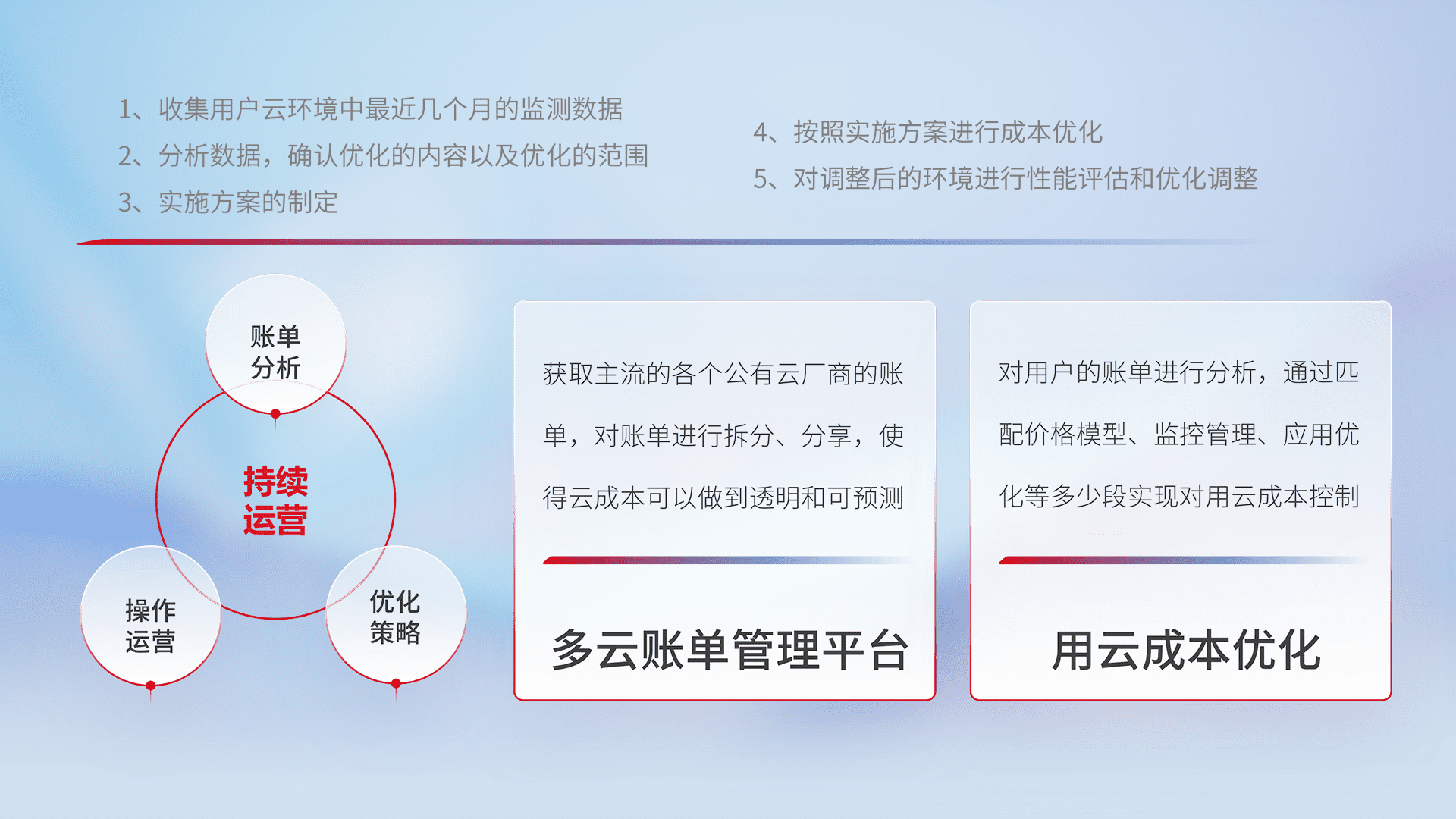 通过多云纳管,,以统一的资源数据模型把客户的云资源进行抽象和封装,,进而实现对多云资源的统一操作,,,保障云资源管理的可靠性、、、、稳定性与可用性。。。量身定制化运维内容,,,,配置、、、开发运维、、、、补丁管理、、备份、、监控、、认证和访问管理、、、审计和日常巡检等,,保障在用云过程中的可靠度,,,,稳定度以及高可用率。。。。
